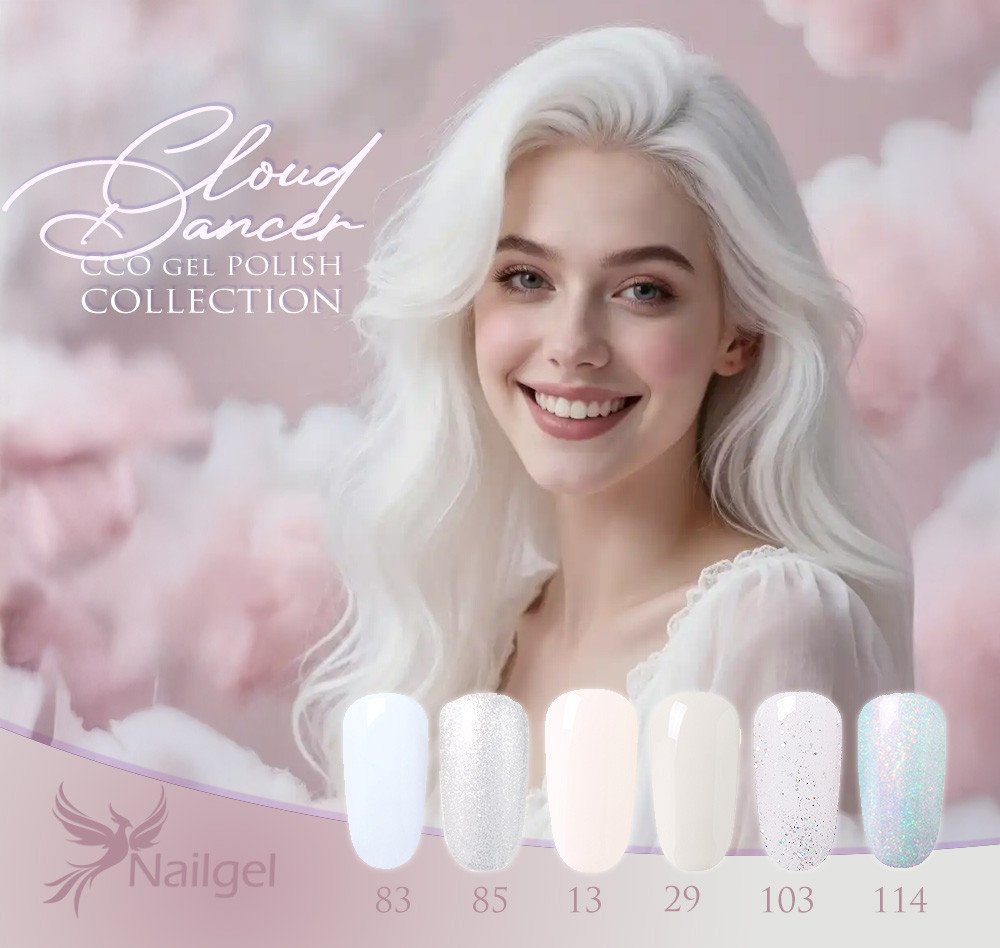The Cloud Dancer collection features clean white shades that radiate freshness, minimalist elegance, and modern sophistication. A perfect choice if you’re looking for clean, soft, and flawless nails — whether for a classic French style or a refined, solid-color look.