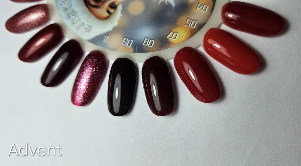 15 pcs of HEMA-free, 8 ml gel polishes in Christmas colors (glass-effect red, reds, burgundies, cat-eye red, various special effects, and glitter shades).