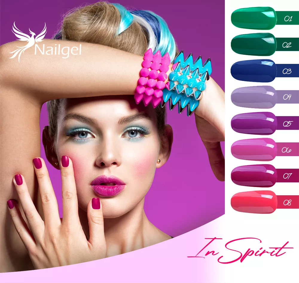 InSpirit gel polish is primarily suitable for painting the entire surface of the nail. It is especially popular due to its simple and fast application. Shake well before use to activate the pigments. The use of InSpirit gel polish begins with gentle buffing of the nail surface. Then push back the cuticles and, if necessary, degrease. Treat your client’s nails with primer and apply Nailgel Smart base universal base coat. You will need a UV lamp for this step too, but only for 1 minute. Then apply the InSpirit gel polish. If you apply it in two layers, cure each layer under the UV lamp. Finally, apply Ultra Shine Top Coat and cure it for 2 minutes under the UV lamp.